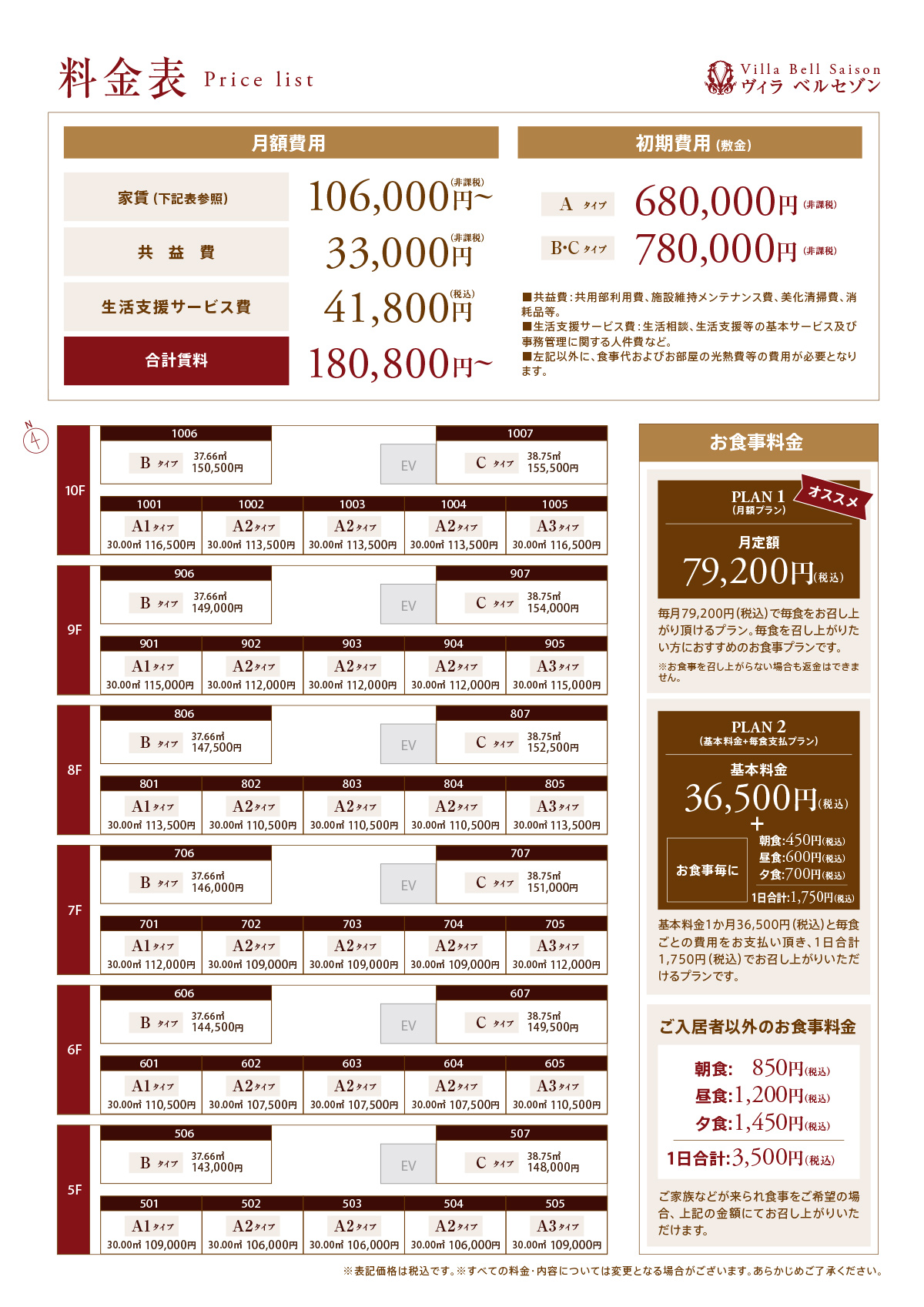 家賃と共益費、生活サポート費で月額180,800円~の費用が必要です。食事代と光熱費及び介護保険サービスをご利用の方は別途費用が必要となります。
