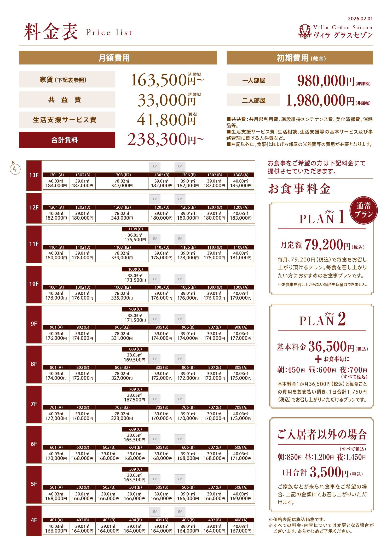 入居契約の際の金額で据え置きとさせていただきたく思っております。しかし諸物価の上昇、その他の経費事情などの変動により不相応となる場合には、協議の上、価格を改定する場合がございます。