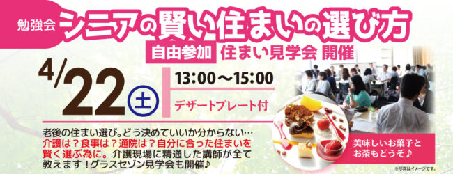 老後の住まい選び。どう決めていいか分からない……。介護は?食事は?通院は?自分に合った住まいを賢く選ぶために、介護現場に精通した講師が全てお教えします。グラスセゾン見学会も開催♪