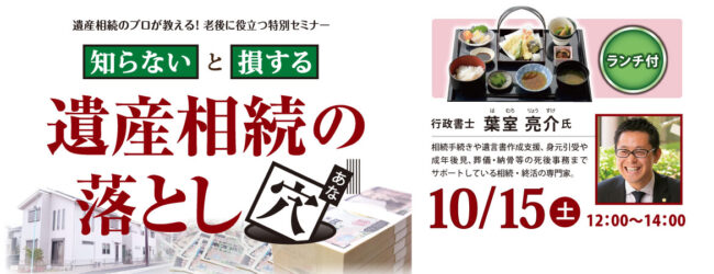 相続・就活の専門家、行政書士 葉室亮介氏による特別セミナー「知らないと損する 遺産相続の落とし穴」を開催します!