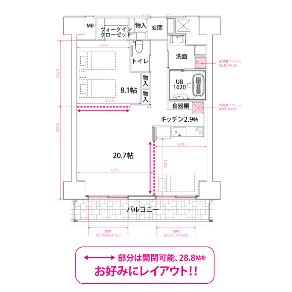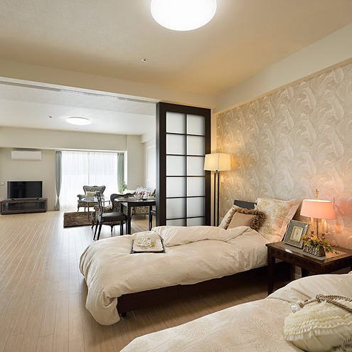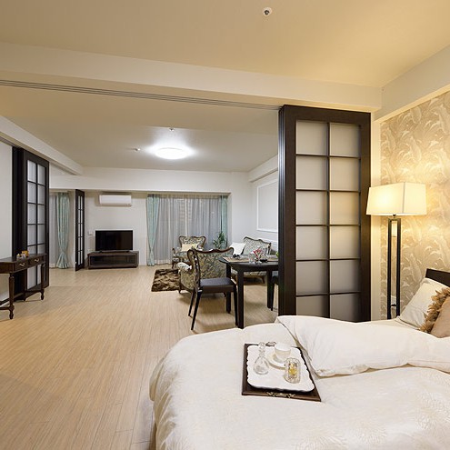 ヴィラシリーズ最大の広さを誇る南向きの2人部屋タイプ。可動式の間仕切りにより、広大な1LDKから2LDK、3LDKへと自由に変更できます。