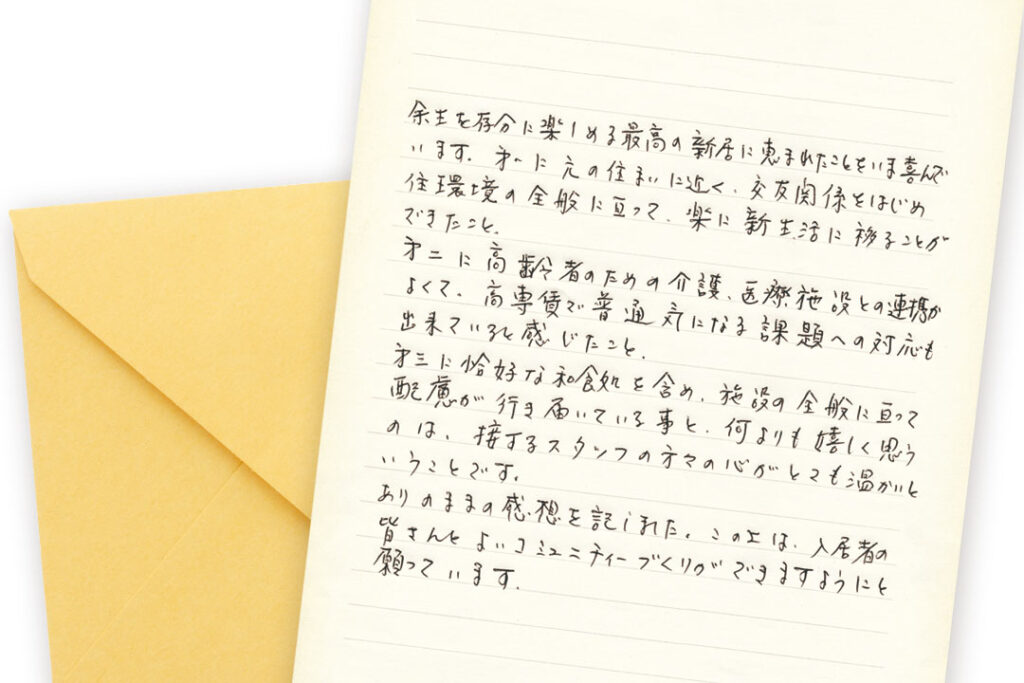 余生を存分に楽しめる最高の新居に恵まれたことを、今喜んでおります。第一に元の住まいに近く、交友関係をはじめ、住環境の全般に亘って、楽に新生活に移ることができたこと。第二に高齢者のための介護・医療施設との連携が良くて、サ高住で普通気になる課題への対応もできていると感じたこと。第三に恰好な和食処を含め施設全般に亘って配慮が行き届いている事と、何より嬉しく思うのは接するスタッフの方々の心がとても温かいということです。(お手紙より一部抜粋)