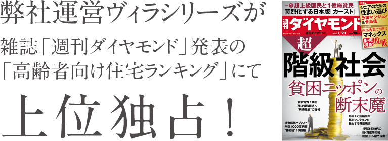 ヴィラシリーズは、週刊ダイヤモンド サ高住ランキングにて関西No.1の評価を得た他、ガイアの夜明け・モーニングバード等のTV番組をはじめ、様々な媒体でご紹介いただき、そのクオリティと妥協のない姿勢が高く評価されています。